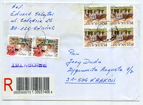 W ostatnich dniach dotarła do nas przesyłka, na którą czekaliśmy, bowiem jest intrygująca a przede wszystkim sprawiła nam radość. Nadawca z Polski, wysłał przesyłkę listową w nieco większej kopercie, adresowaną do odbiorcy w Estonii. A jak przesyłkę ofrankował widać na for. 1,a,b. Mamy także inny przykład ciekawego zagospodarowania koperty przy pomocy znaczków z motywem krakowskim. Kopertę dużego formatu, przesyłki zagranicznej ofrankowano wykorzystując i znaczek Fi.3806 i bloki wydane z okazji 450 lecia Poczty Polskiej. Całość pokazana na fot.2. I wreszcie koperta przesyłki listowej z obrotu krajowego wysłanej w 2009 roku, a więc po 7 latach od wprowadzenia znaczka Fi.3906 do obiegu pocztowego. (fot,3).